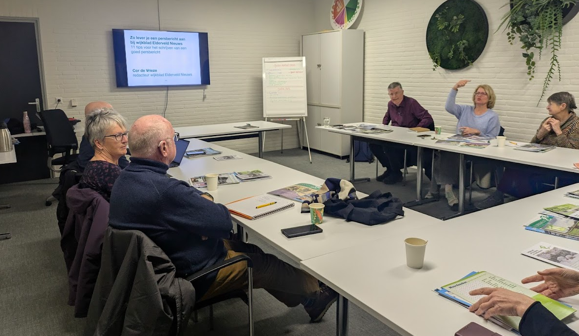 Cor de Vrieze van Elderveld Nieuws nam ons mee in de laatste editie van zijn wijkkrant. Ook gaf hij een presentatie over het aanleveren van persberichten. Daarna was er tijd voor het delen van tips en verhaal onderwerpen. Denk hierbij aan een serie artikelen over oude foto’s uit de wijk, drie generaties over de wijk aan het woord laten of artikelen over historie en straatnamen. Andere tips waren bijvoorbeeld: maak een jaarplanning en denk eens aan de digitale verspreiding. Verder zijn zorgen geuit over de financiële situatie. De gemeente moet bezuinigen en sommige wijkkranten weten al dat ze minder geld gaan krijgen volgend jaar. Dit houden we in de gaten.